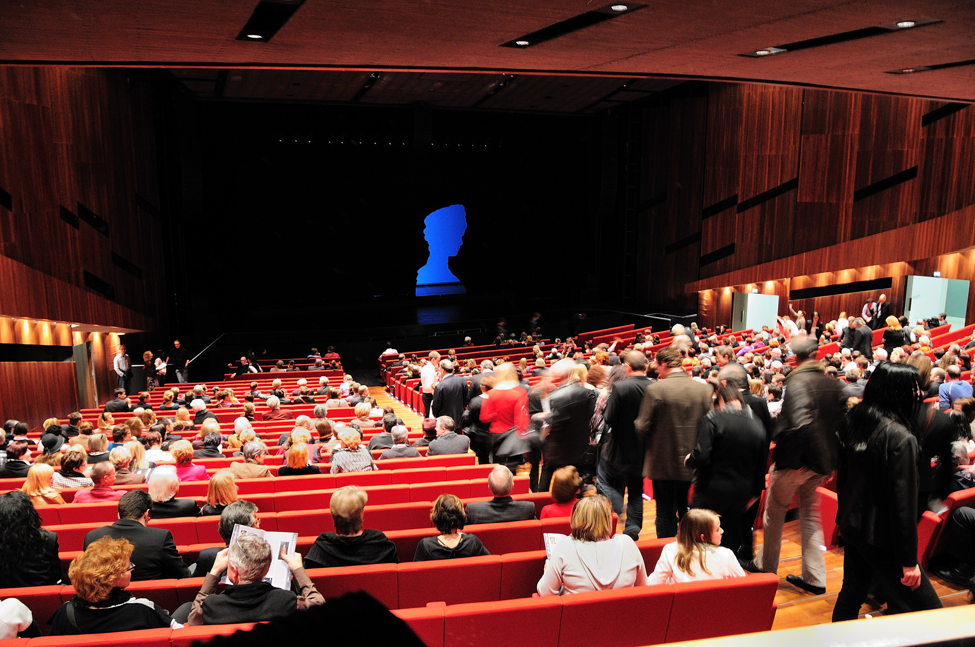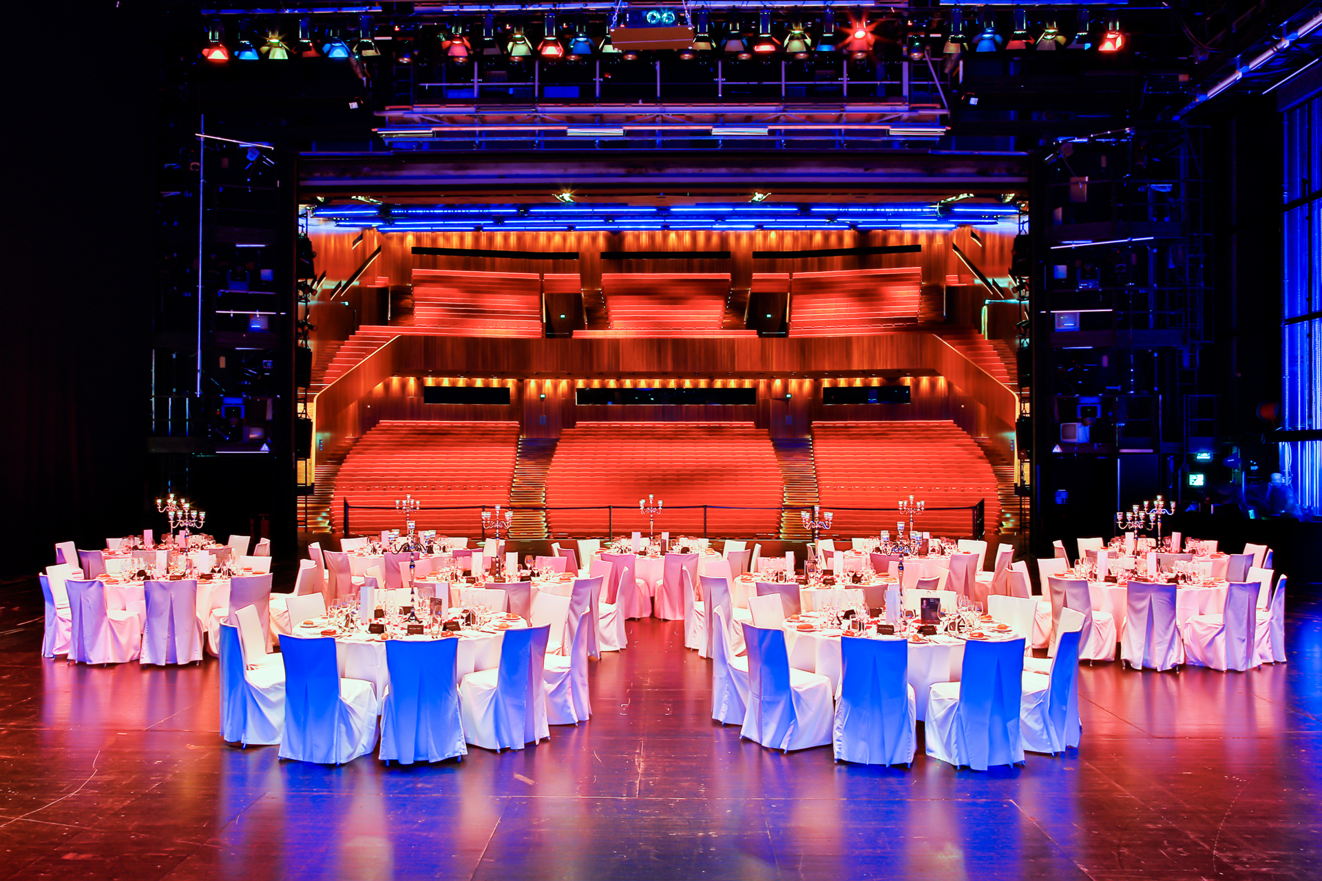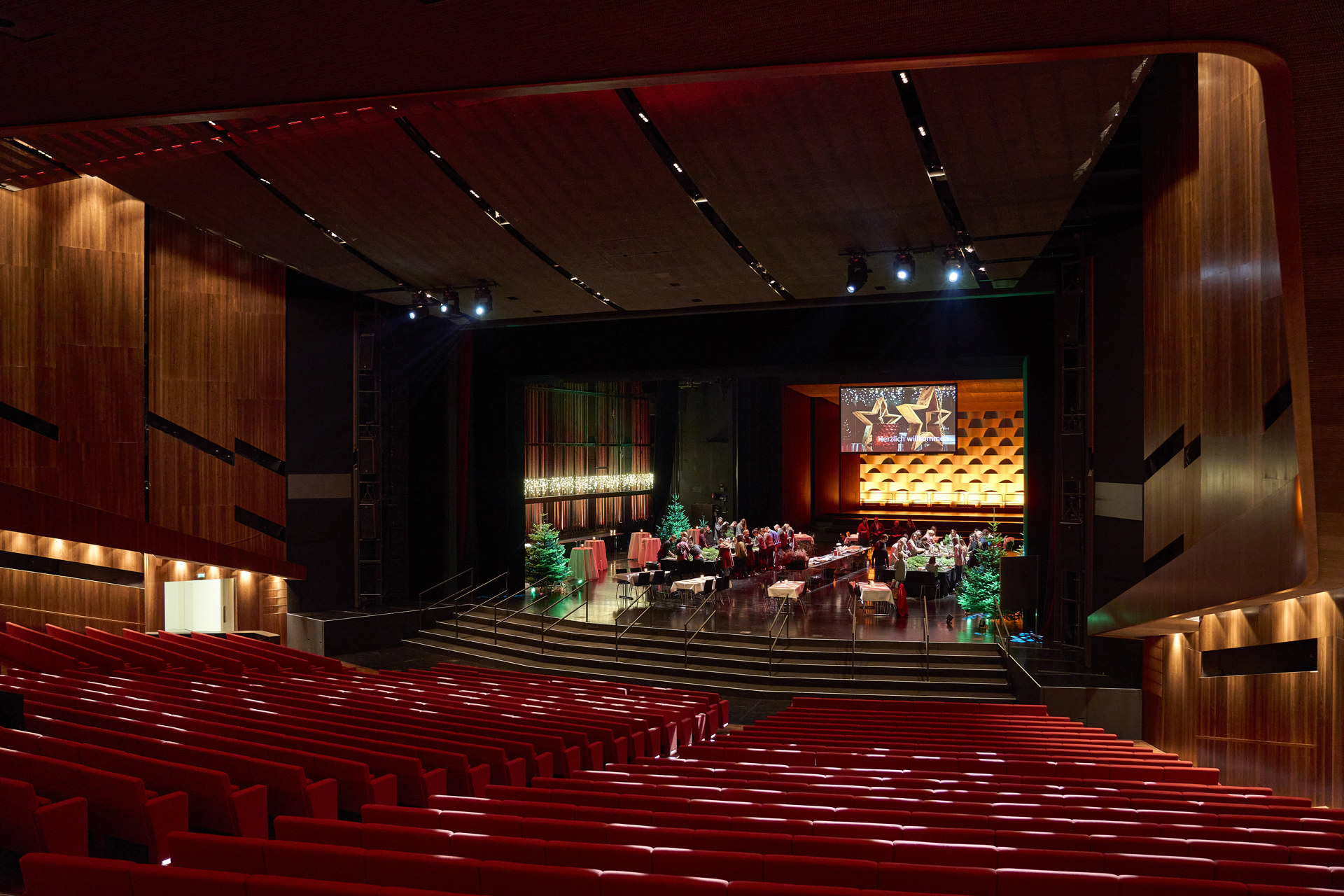 Der Große Saal bietet mit seiner Kombination aus dunklem Akazienholz und rot bezogenen Stühlen eine warme, einladende Atmosphäre. Eine der größten Drehbühnen Europas und die vollständige Ausstattung für Theater, Konzert und Oper machen den Raum zu einem Hotspot für Kulturveranstaltungen.