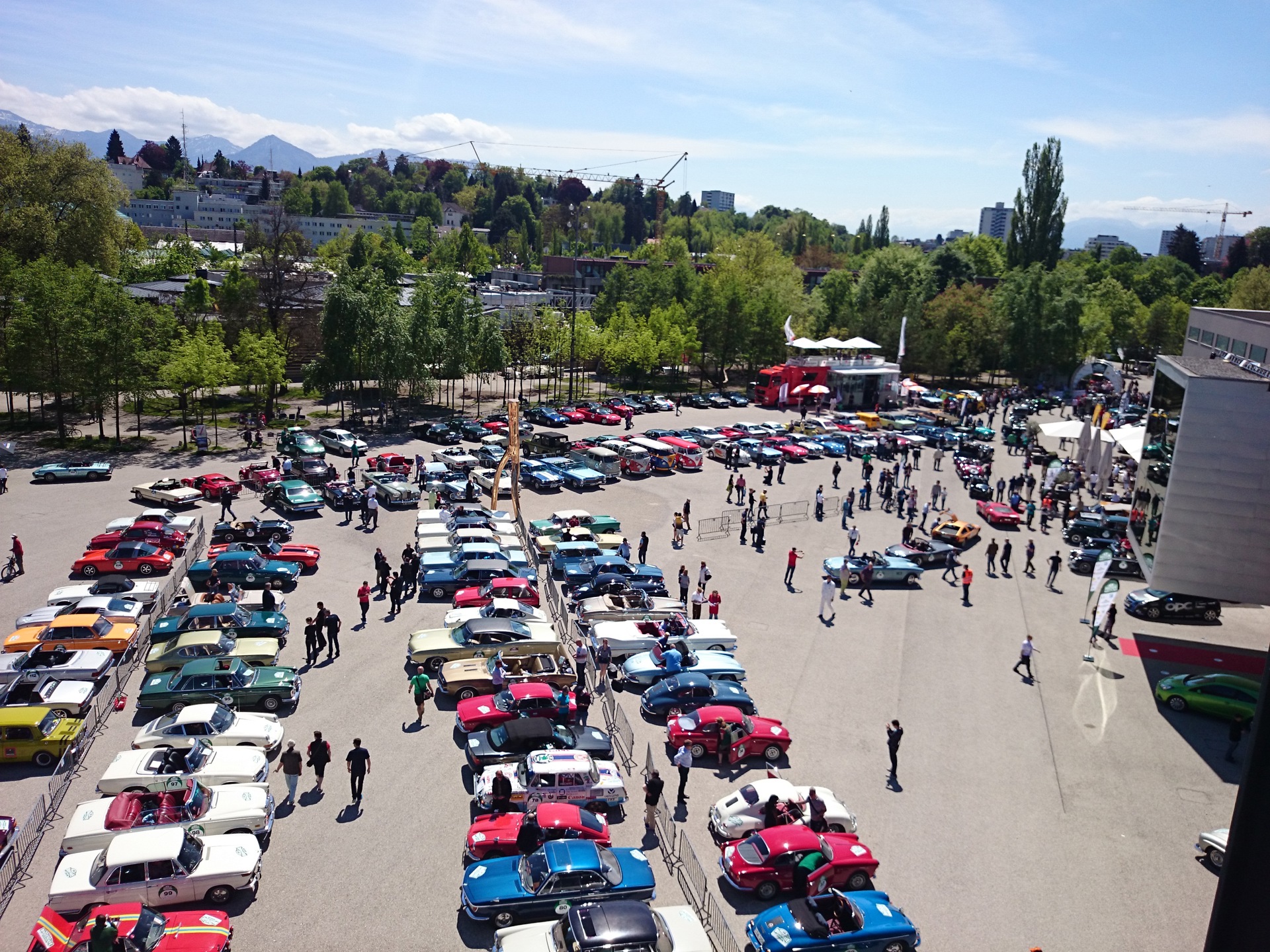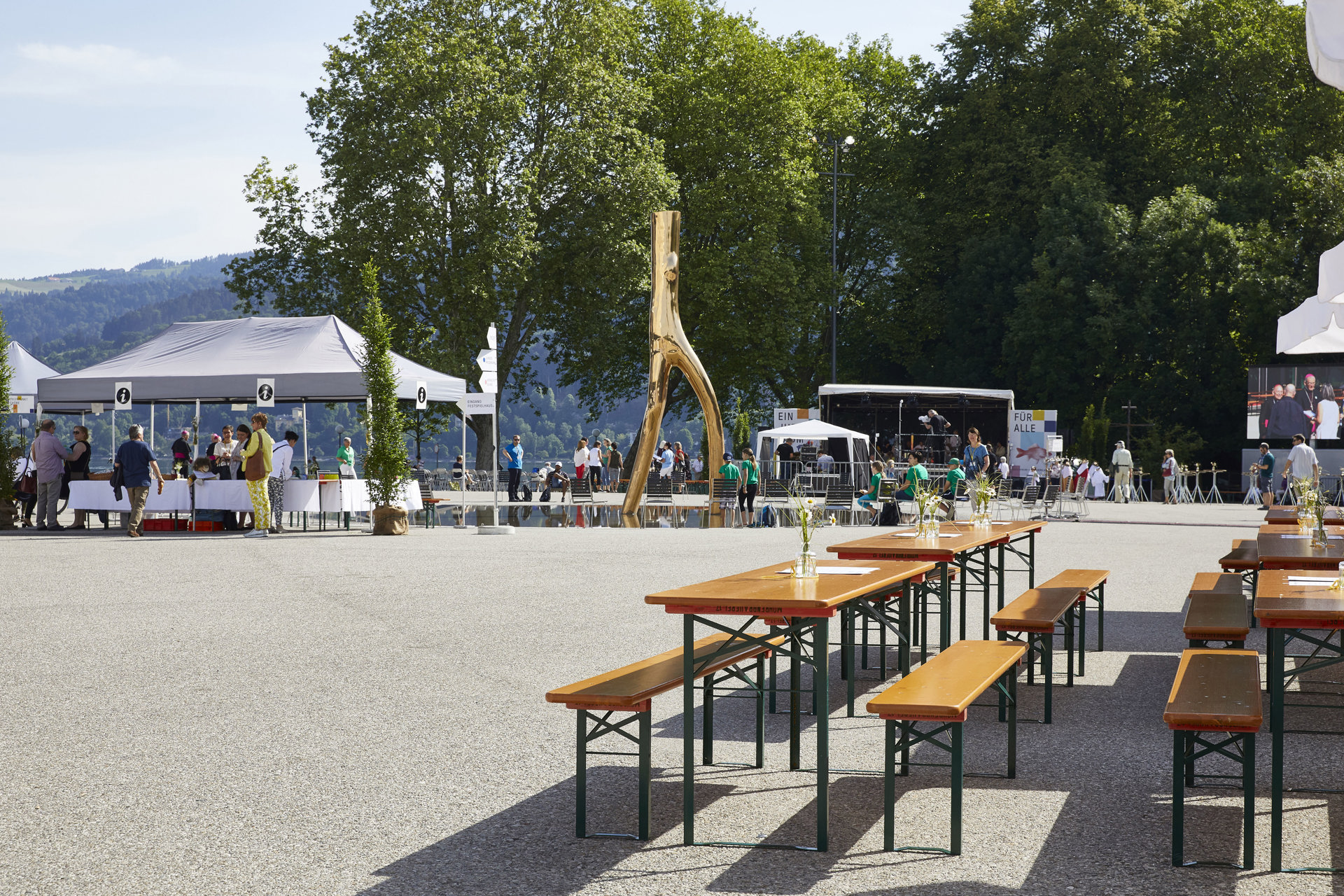 In den Sommermonaten Juli und August verwandelt sich der Platz in eine lebendige Plaza mit großem Gastronomieangebot für die Gäste der Bregenzer Festspiele.