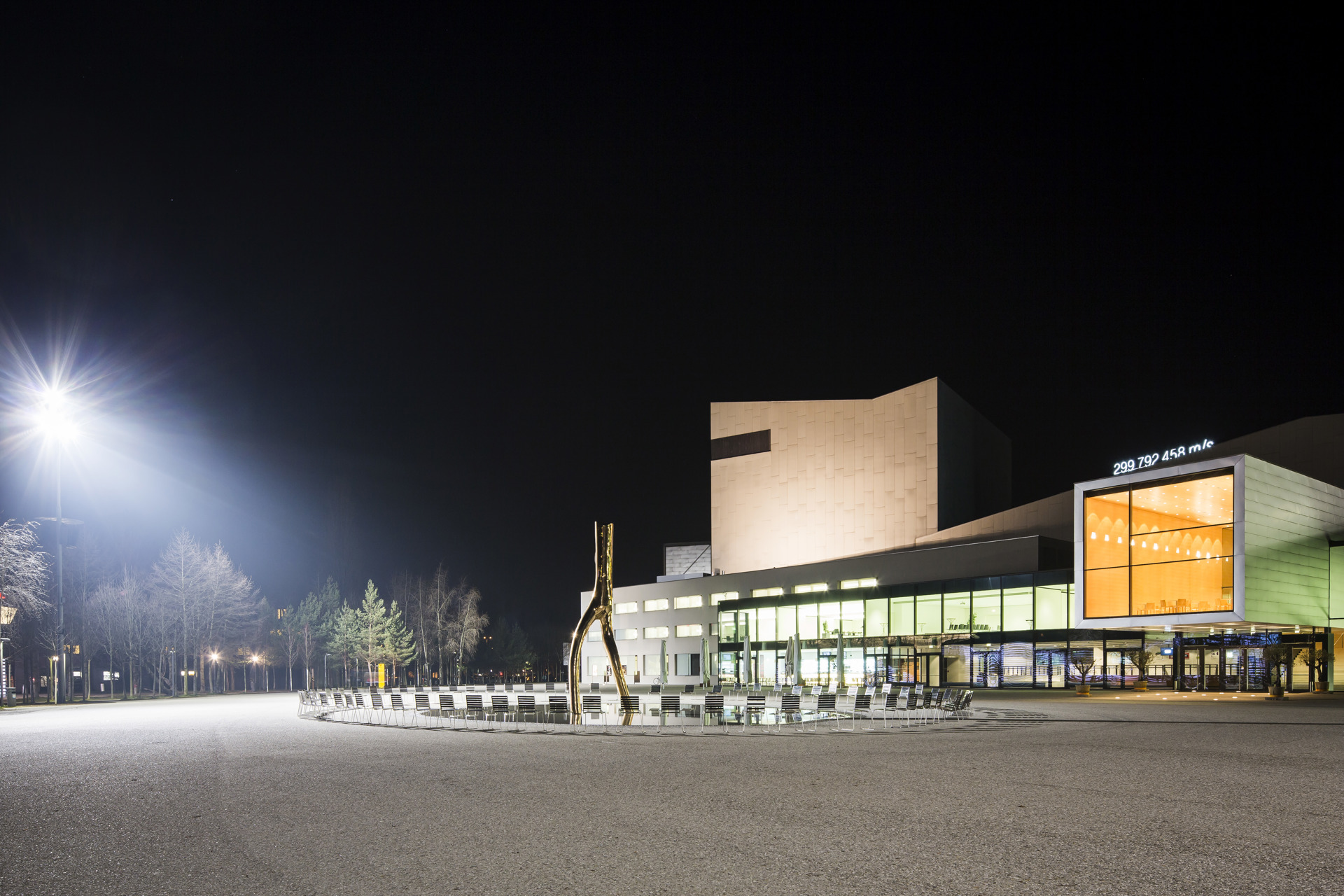 Bestimmt fragten Sie sich schon, was die Ziffern auf dem Dach des Festspielhauses Bregenz zu bedeuten haben. Es ist eine Lichtinstallation des Künstlers Cerith Wyn Evans. Sein in Leuchtschrift ausgeführter Schriftzug „299.792.458 m/s“ verweist auf die numerische Darstellung der Lichtgeschwindigkeit und ist Siegerprojekt eines “Kunst am Bau-Wettbewerbs".