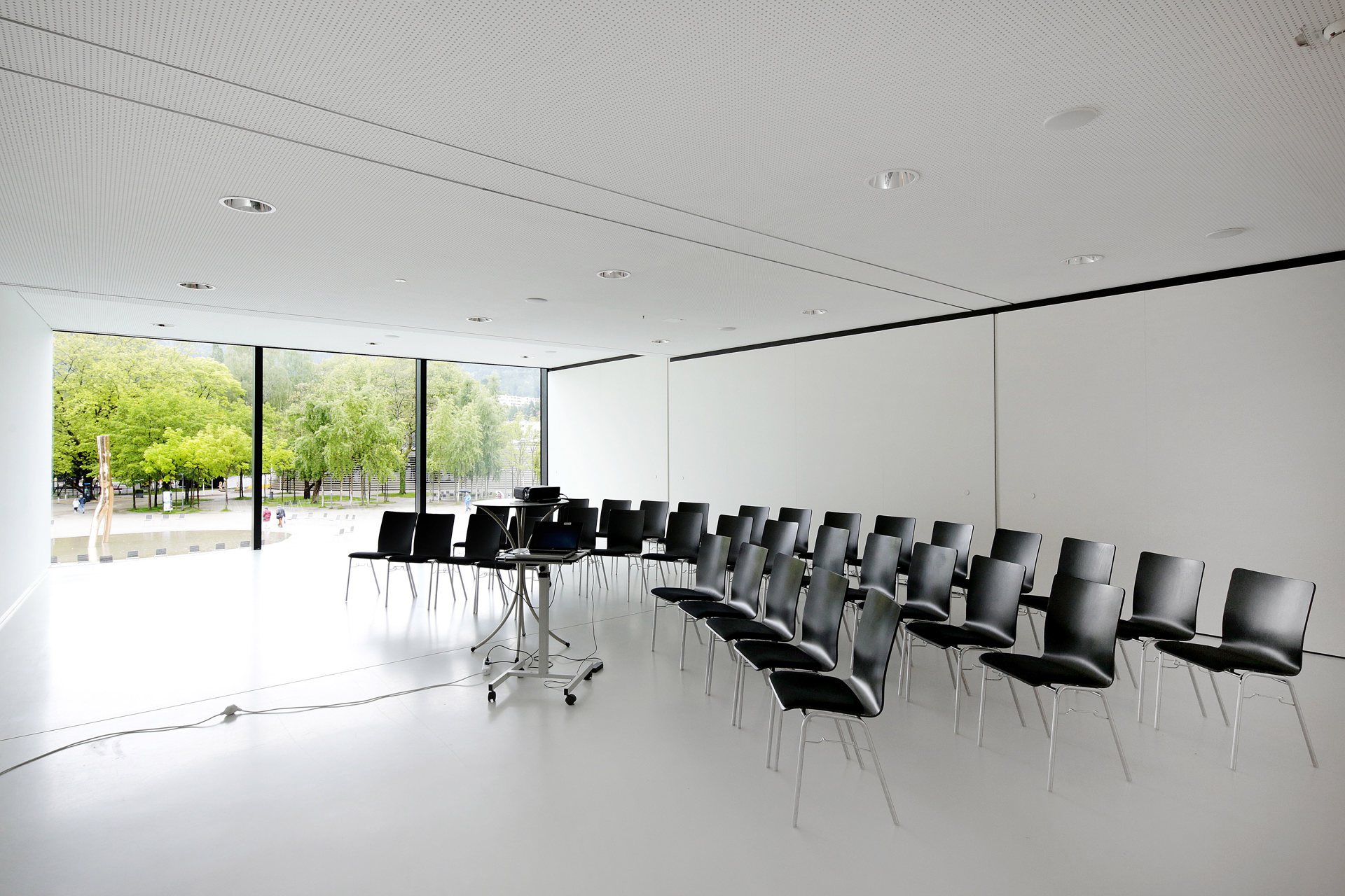 Die große Glasfront bietet einen einzigartigen Blick auf den Platz der Wiener Symphoniker und die markante Skulptur “Ready Maid”. Die östliche Ausrichtung des Saales sorgt für natürliches Morgenlicht und das schafft eine angenehme Atmosphäre für Veranstaltungen. Selbstverständlich gibt es die Möglichkeit, die Fensterfront abzudunkeln, das bedeutet Flexibilität für Veranstaltungen zu jeder Tageszeit.
