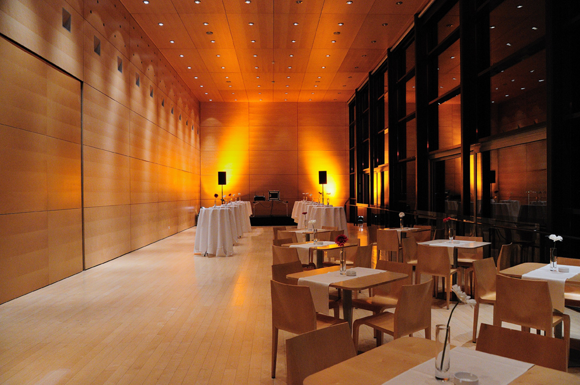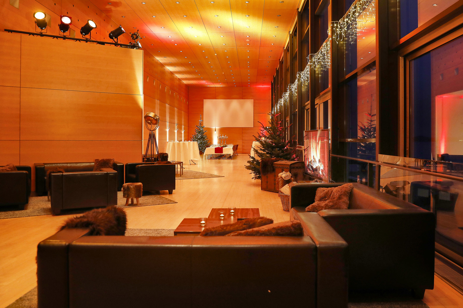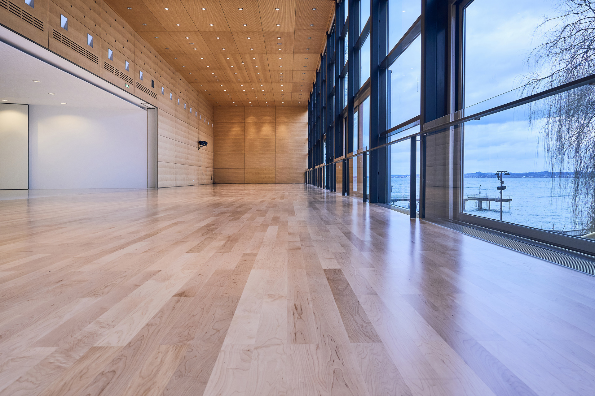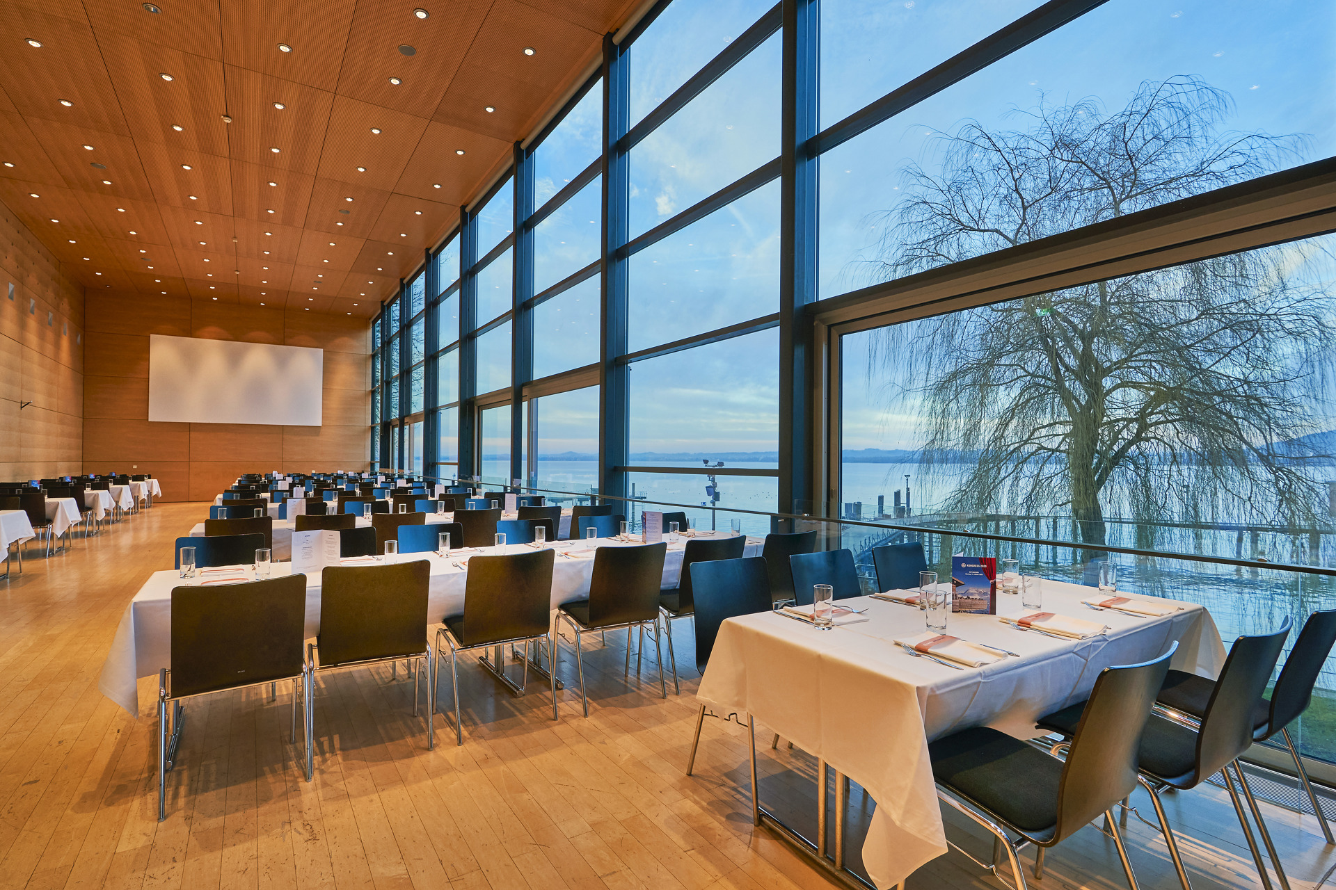Wenn Sie eine Räumlichkeit mit dem gewissen Etwas suchen, dann wird Ihnen das Seefoyer gefallen: Die Glasfront des Raumes macht die Sicht frei auf die imposante Seebühne der Bregenzer Festspiele, die umliegenden Berge sowie die Inselstadt Lindau. Das helle Ahornholz und die stattliche Raumhöhe von sechs Metern tragen zusätzlich zum großzügigen Ambiente bei.