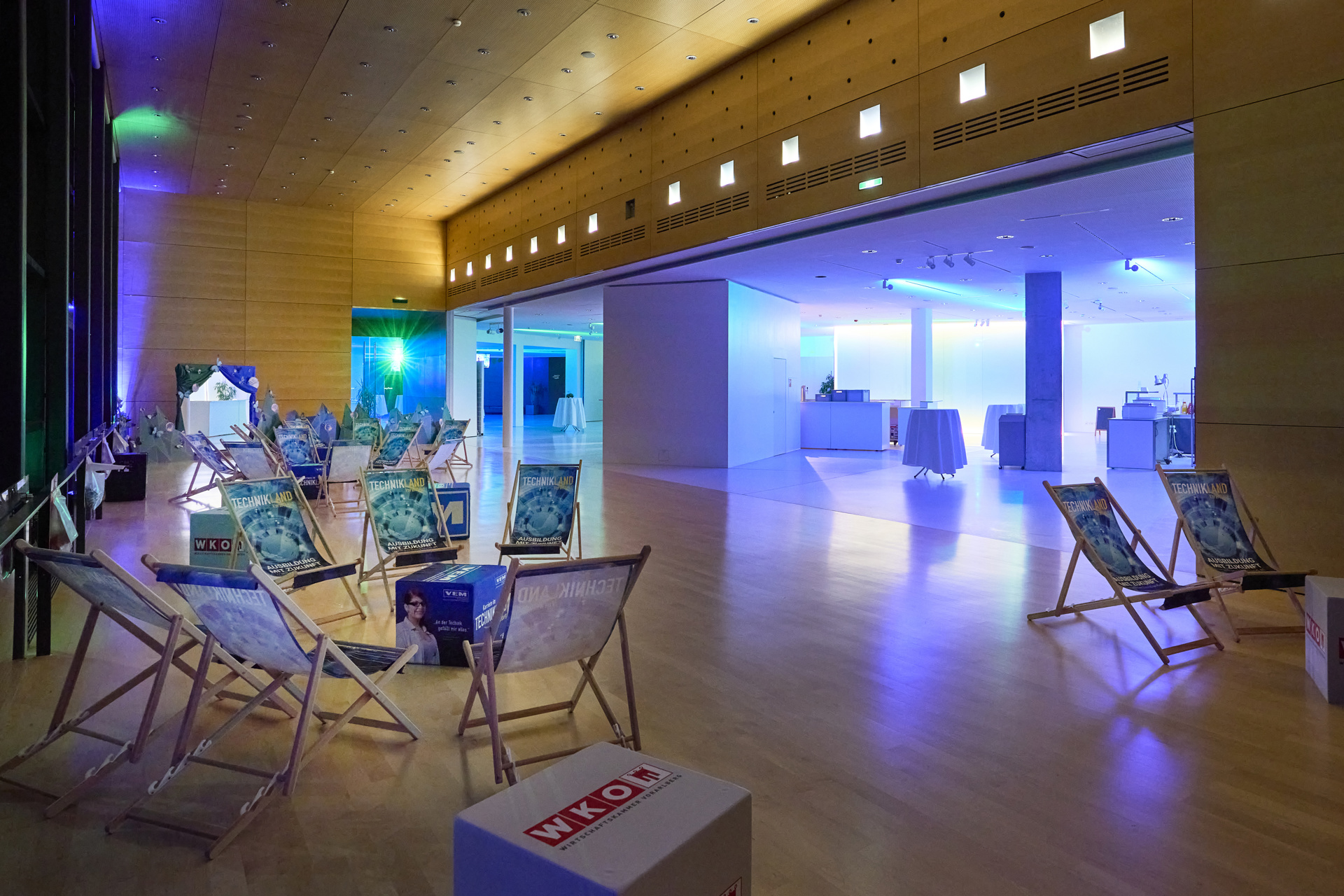 Der Raum für maximal 300 Personen hat dank seines klaren Designs ein modernes Flair. Die durchgehende Fensterfront ist mit einer Abdunkelung versehen. Bei Bedarf kann der Raum zum Foyer 2 erweitert werden, ideal für größere Corporate Events, Präsentationen und Kongresse mit begleitenden Ausstellungen oder Messen. Wie auf der gesamten Ebene 1 ist der Zugang für Aussteller:innen über den Lastenlift möglich, was die Logistik erleichtert.
