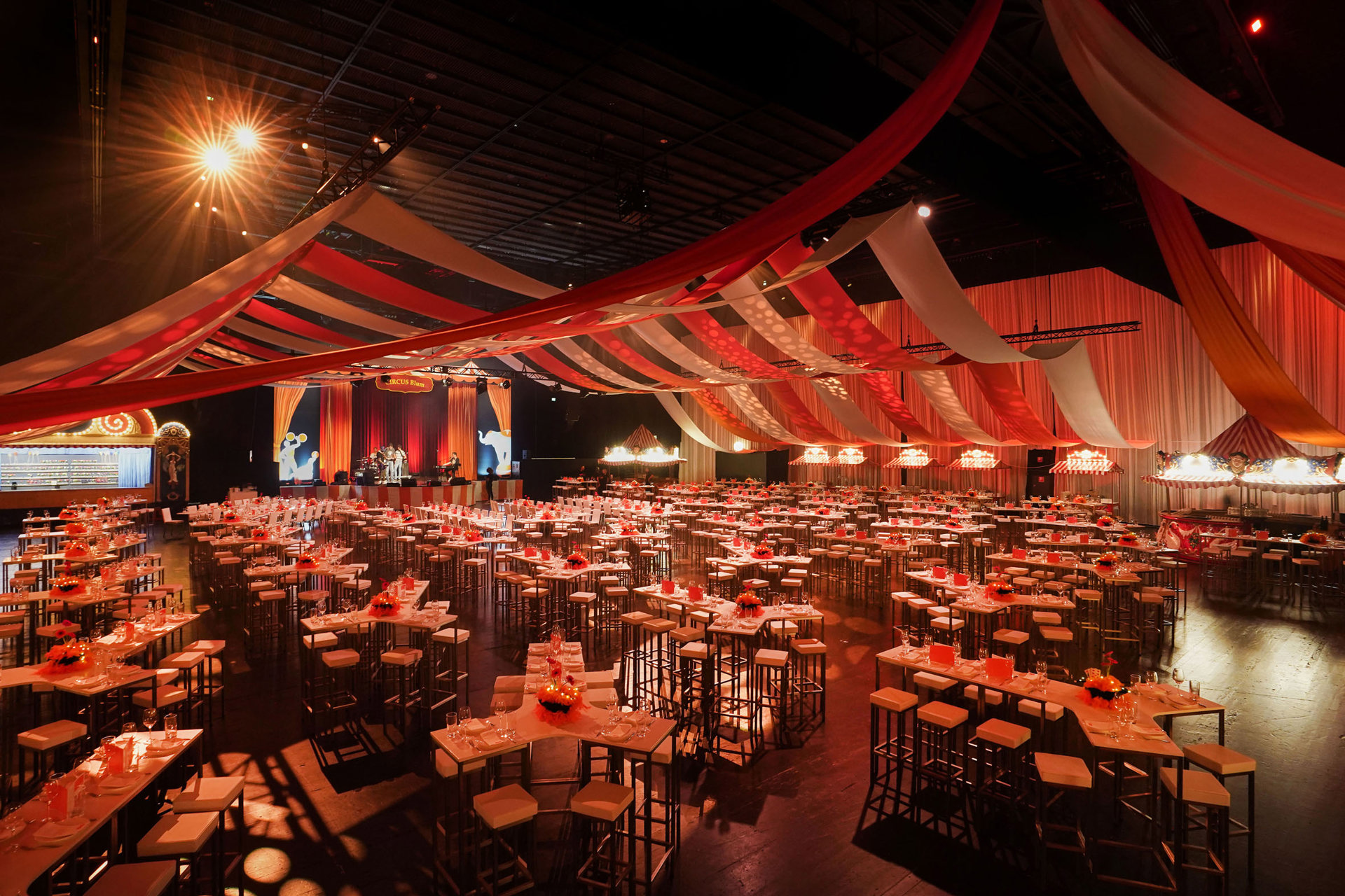 Wir nutzen die Möglichkeit, die Werkstattbühne mittels Traversen und Vorhängen in mehrere Räume zu unterteilen. Bei einer Firmenfeier beispielsweise wurden je nach Programmpunkt Vorhänge hochgefahren, um den Blick sowie den Zugang zu dem jeweiligen Bereich freizugeben. Solche Ideen setzen wir auch bei Galadinners um, bei denen wir die Bühne mit Showprogramm und eine abgetrennte Cocktail-Bar in einer Location vereinen.