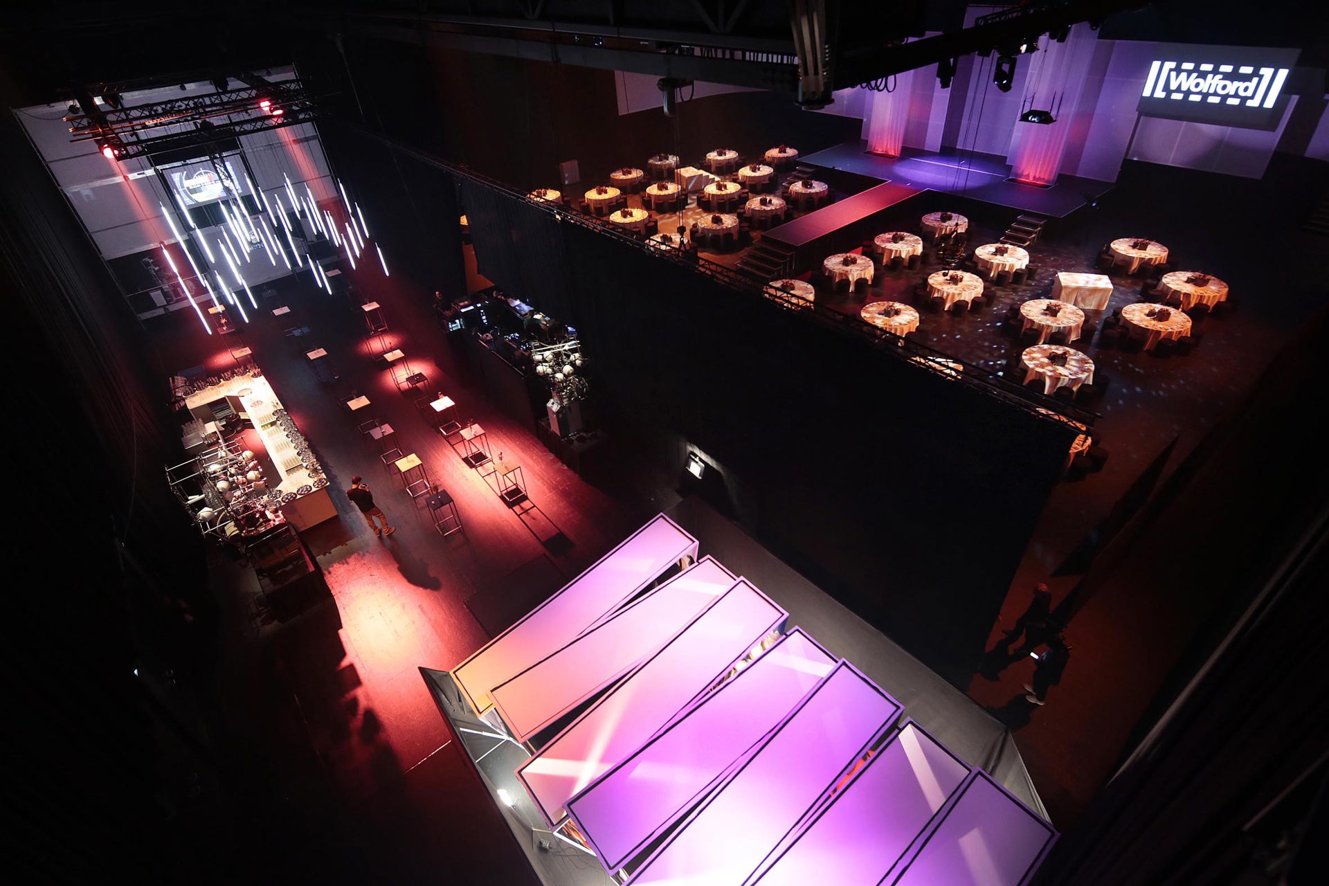 Ich erinnere mich an eine Verkaufstagung der Firma Blum. Um die Gäste zusammenzubringen, gab es nicht nur ein Galadinner, sondern auch Spiele. Dieser Ansatz ist voll aufgegangen. Aus technischer Sicht war das Besondere, dass zwei Moderatoren gleichzeitig von der Decke eingeflogen sind. Grundsätzlich hat die Werkstattbühne den großen Vorteil, dass wir sie sehr schnell verändern können.